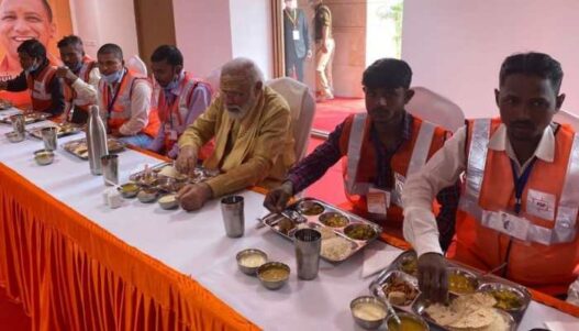 नई दिल्ली। पीएम मोदी ने सोमवार को काशी विश्वनाथ कॉरिडोर का लोकार्पण किया। इसका शुभ मुहूर्त रेवती नक्षत्र में दोपहर 1.37 बजे से 1.57 बजे तक 20 मिनट का था। कॉरिडोर के लोकार्पण के बाद पीएम मोदी ने निर्माण में शामिल मजदूरों पर पुष्प वर्षा कर सम्मानित किया। साथ ही उनके साथ फोटो खिंचवाकर उनके साथ खाना भी खाया। पीएम मोदी ने खाने की थाली में पापड़, रोटी, दाल, मिक्सवेज, खीर, चावल और मिठाई का स्वाद लिया। इस दौरान उन्होंने कॉरिडोर बनाने में लगे निर्माण श्रमिकों की तारीफ भी की।