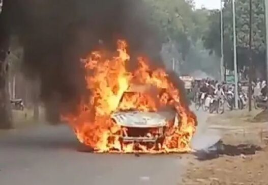 गाजियाबाद। गाजियाबाद में शनिवार को एक चलती कार में अचानक आग लग गई। आग बेहद भीषण थी और कुछ पलों में ही आग की तेज लपटों ने पूरी गाड़ी को घेर लिया। दोनों तरफ से ट्रैफिक चल रहा था इसी दौरान कार में ब्लास्ट भी हुआ। हालांकि गनीमत रही कि इस हादसे में ड्राइवर को कोई नुक्सान नहीं हुआ है। उसने पहले से कार से कूदकर अपनी जान बचा ली।