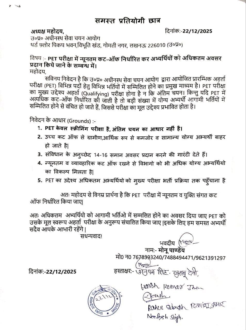 लखनऊ: उत्तर प्रदेश अधीनस्थ सेवा चयन आयोग (UPSSSC) द्वारा आयोजित प्रारम्भिक अहर्ता परीक्षा (PET) को लेकर प्रतियोगी छात्रों और कर्मचारियों ने न्यूनतम व युक्तिसंगत कट-ऑफ तय करने की मांग की है। इस संबंध में 22 दिसंबर 2025 को आयोग के अध्यक्ष को एक ज्ञापन सौंपा गया।