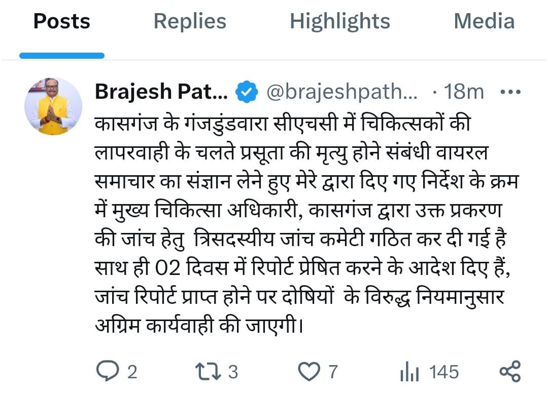 कासगंज सीएचसी में प्रसूता की मौत पर डिप्टी सीएम ब्रजेश पाठक सख्त, 3 सदस्यीय जांच कमेटी गठित