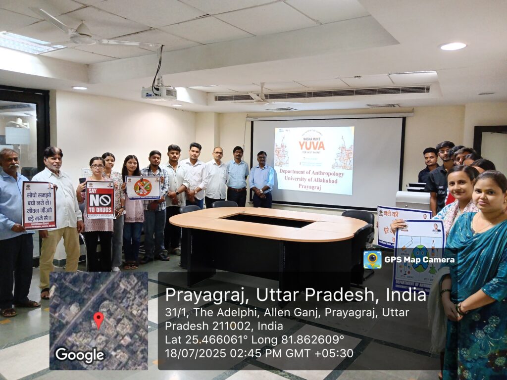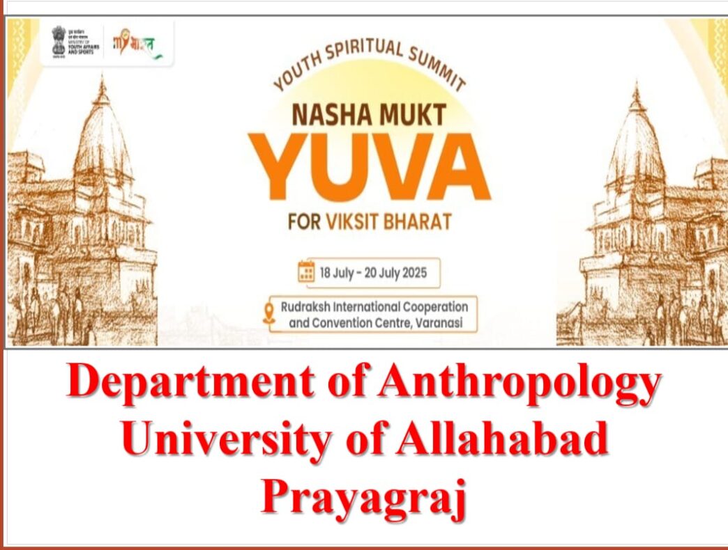 मानवविज्ञान विभाग, इलाहाबाद विश्वविद्यालय में आज दिनाँक 18 जुलाई 2025 को युवा कार्यक्रम एवं खेल मंत्रालय द्वारा वाराणसी में युवा आध्यात्मिक शिखर सम्मेलन के आयोजन के मद्देनजर “विकसित भारत के लिए नशा मुक्त युवा” विषयक कार्यक्रम का आयोजन किया गया। आयोजन का मुख्य उद्देश्य युवाओं को नशे की लत से मुक्ति दिलाना, उनमें नशे के दुष्प्रभावों के प्रति जागरूकता पैदा करना और राष्ट्र निर्माण में उनकी भूमिका को मज़बूत करना है।