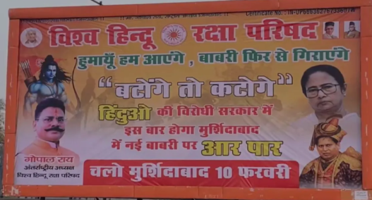 मुर्शिदाबाद में बन रही एक नई मस्जिद के निर्माण के विरोध में उत्तर प्रदेश की राजधानी लखनऊ के कई चौराहों पर पोस्टर लगाए गए हैं। इन पोस्टरों में 10 फरवरी को मुर्शिदाबाद कूच का आह्वान किया गया है। यह पोस्टर विश्व हिंदू रक्षा परिषद की ओर से लगाए जाने का दावा किया गया है।